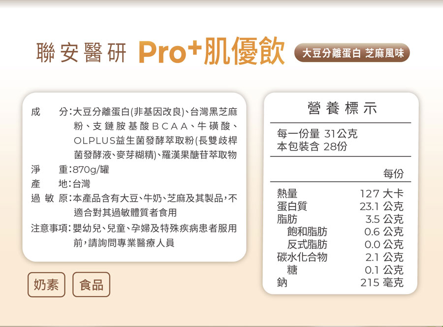 聯安醫研保健品-Pro+肌優飲 (大豆分離蛋白-芝麻風味)